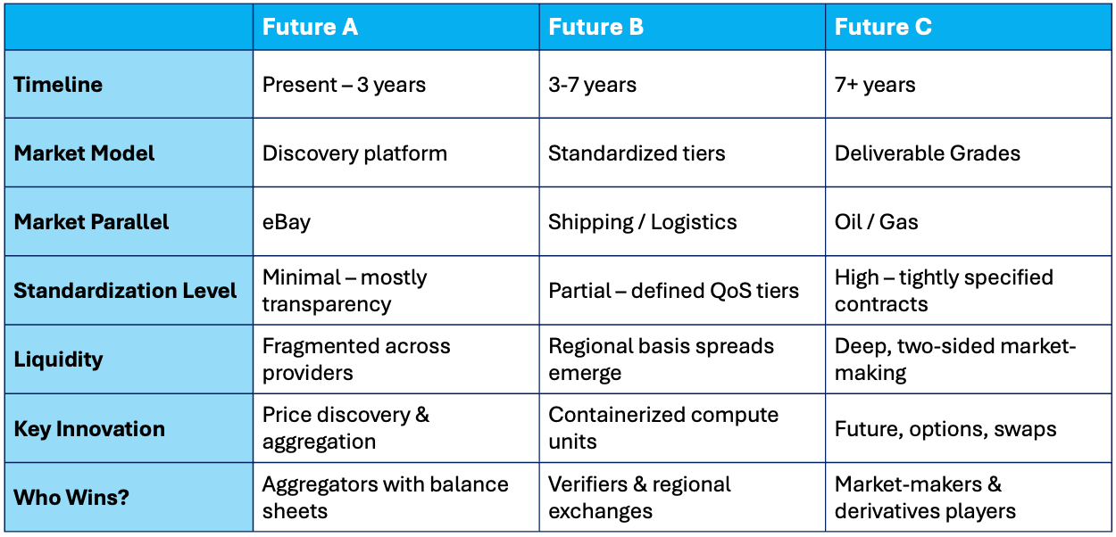 This is the fully financialized endgame, where compute trades like oil or natural gas. Deliverable grades are tightly specified: “A-class FP8 GPU-hour, ≥80GB HBM3, ≥400 Gbps intra-node interconnect, US-East-1 zone, 99% uptime.” Substitution bands are clear. Futures, options, and swaps reference those grades, and market-makers provide two-sided liquidity. This is a decade-plus vision requiring deep liquidity and regulatory clarity.